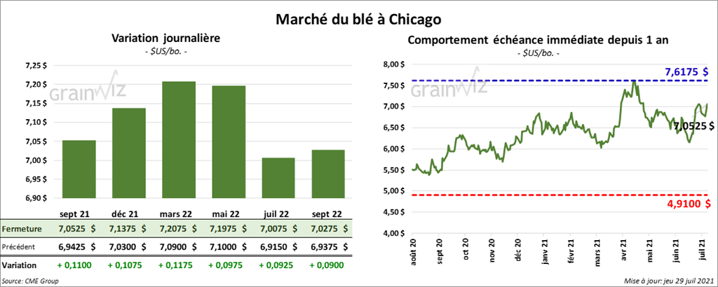 À Chicago, les contrats de blé aux échéances les plus rapprochées ont fini la journée en hausse entre 9 ¾ et 11 ¾ cents. À Kansas, ceux de blé dur rouge aux échéances les plus rapprochées ont aussi clôturé avec des gains entre 13 ½ et 15 cents. À Minneapolis, les contrats de blé de printemps aux échéances les plus rapprochées ont terminé en progression entre 8 ½ et 14 ¾ cents.