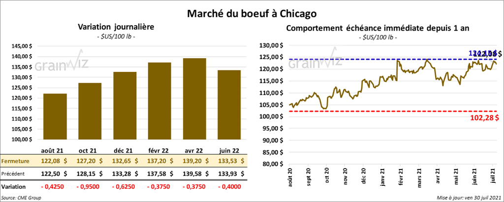 - Le 28 juillet dernier, le CME Feeder Cattle Index était en baisse de 36 cents à 154,00 $.