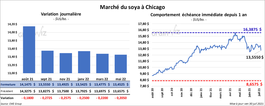 Les contrats de soya US aux échéances les plus rapprochées ont terminé la journée en baisse entre 18 et 27 ¼ cents. Ceux de tourteau de soya US aux échéances les plus rapprochées ont également fermé dans le rouge entre 3,90 et 5,50 $/tonne. Les contrats d’huile de soya US aux échéances les plus rapprochées ont clôturé en recul entre 170 et 111 points.