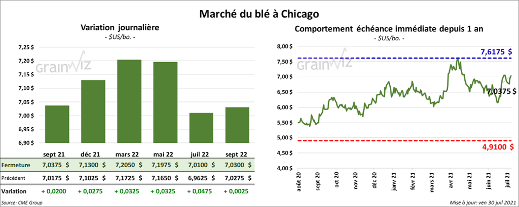 À Chicago, les contrats de blé ont fini la séance en hausse entre 2 et 3 ¼ cents. À Kansas, ceux de blé dur rouge ont terminé entre le neutre et une baisse de 1 ¼ cent. À Minneapolis, les contrats de blé de printemps ont clôturé avec des pertes entre 8 ¾ et 13 ¾ cents.