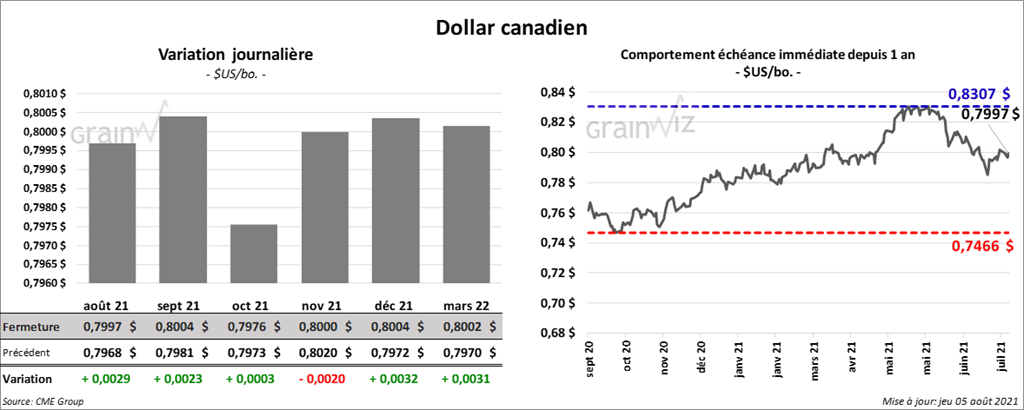 - Durant la semaine du 29 juillet dernier, les ventes à l’exportation de maïs US 2020/21 ont été de 68,200 tonnes, ce qui était une baisse notable par rapport à la semaine précédente et une hausse notable comparativement à la moyenne des 4 dernières semaines. Le Mexique et le Canada ont été les principaux acheteurs. Pour 2021/22, les ventes ont été de 830,200 tonnes. Le Mexique et le Japon étaient les plus gros acheteurs. Les analystes s’attendaient à ce que les ventes de maïs US soient entre 50,000 et 800,000 tonnes.