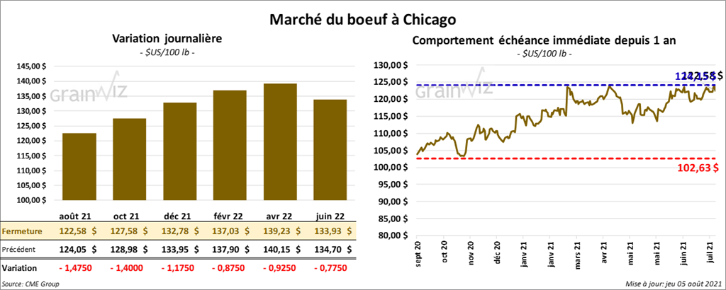 Les contrats de bœuf US aux échéances les plus rapprochées ont terminé la journée en baisse entre 87 cents et 1,47 $. Ceux de veau US aux échéances les plus rapprochées ont clôturé en recul entre 1,55 et 1,72 $.