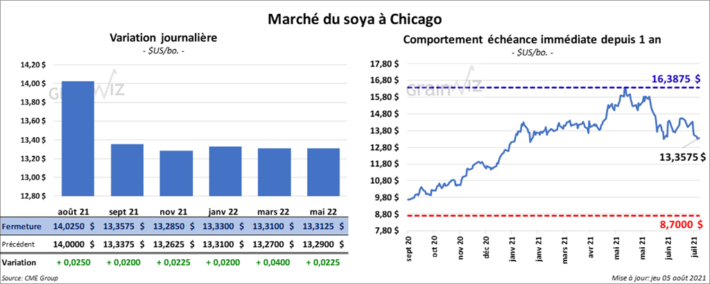 Les contrats de soya US aux échéances les plus rapprochées ont terminé la session en hausse entre 2 et 2 ¼ cents. Ceux de tourteau de soya US aux échéances les plus rapprochées ont également clôturé dans le vert entre 3,30 et 4,00 $/tonne. Les contrats d’huile de soya US aux échéances les plus rapprochées ont fermé avec des pertes entre 79 et 85 points.