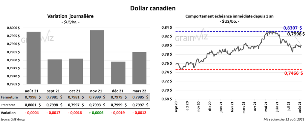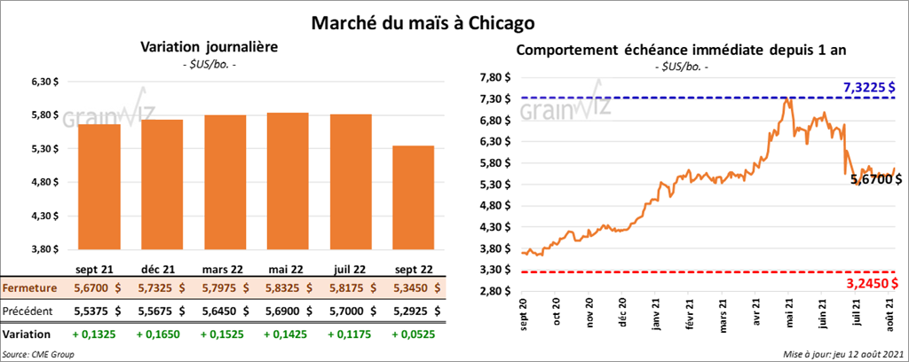 - Le rapport d’offre et de demande du mois d’août a été présenté ce midi. Dans le cas du maïs US, l’USDA a estimé les inventaires de fin d’année 2020/21 à 1,117 milliard de boisseaux alors que les attentes des analystes étaient de 1,096 milliard de boisseaux. C’est donc une augmentation par rapport aux 1,082 milliard de boisseaux estimés en juillet dernier. Pour 2021/22, les stocks de fin d’année de maïs US ont été évalués à 1,242 milliard de boisseaux, ce qui correspond à une réduction comparativement à l’estimation de 1,432 milliard de boisseaux de juillet dernier. Les anticipations des analystes étaient de 1,297 milliard de boisseaux. Quant aux rendements de maïs US 2020/21, ils sont stables par rapport à juillet dernier à 172 bo/acre. Par contre, ceux de 2021/22 ont été estimés en baisse de 179,5 bpa à 174,6 bpa. Les prévisions des analystes étaient de 177,6 bpa. Du côté de la production de maïs US, l’USDA estime que celle de 2021/22 est en baisse de 15,155 milliards de boisseaux en juillet dernier à 14,750 milliards de boisseaux ce mois-ci. Les projections des analystes étaient de 15,155 milliards de boisseaux.