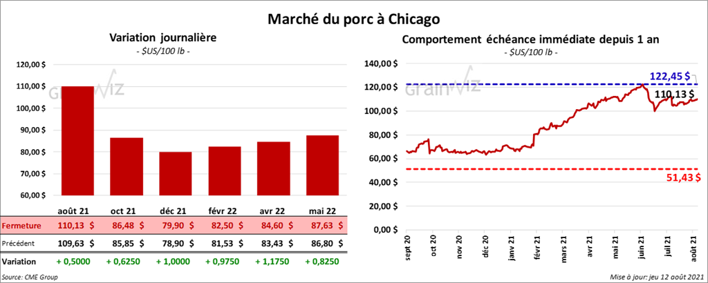 - Le 10 août dernier, le CME Lean Hog Index était en baisse de 32 cents à 110,45 $.