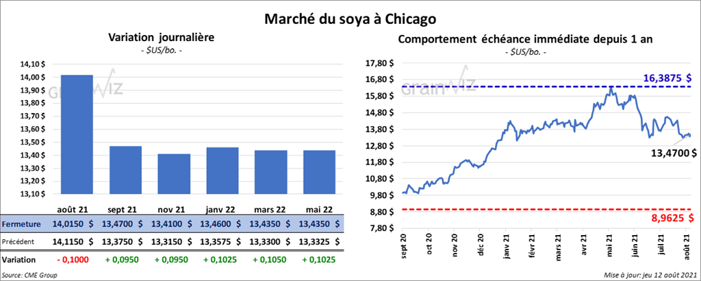 - Concernant le rapport d’offre et demande présenté aujourd’hui, l’USDA a estimé les inventaires de fin d’année de soya US 2020/21 à 160 millions de boisseaux. En juillet dernier, c’était moins élevé à 135 millions de boisseaux. Les prévisions des analystes étaient de 148 millions de boisseaux. Pour 2021/22, les stocks ont été évalués à 155 millions de boisseaux versus 155 millions de boisseaux en juillet dernier. Les projections des analystes étaient plus élevées à 159 millions de boisseaux. Les rendements pour 2021/22 ont été estimés à 50,0 bo/acre, soit à une baisse comparativement à 50,8 bpa en juillet dernier. Les prévisions des analystes étaient également plus élevées à 50,4 bpa. Quant à la production de soya US 2021/22, elle a été estimée à 4,339 milliards de boisseaux alors que les projections des analystes étaient plus élevées à 4,375 milliards de boisseaux.