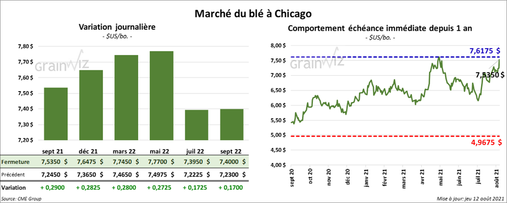 À Chicago, les contrats de blé US aux échéances les plus rapprochées ont clôturé en hausse entre 27 ¼ et 29 cents. À Kansas, les contrats de blé dur rouge aux échéances les plus rapprochées ont fermé en progression entre 26 ½ et 28 ¾ cents. À Minneapolis, ceux de blé de printemps aux échéances les plus rapprochées ont terminé la journée avec des gains entre 16 ½ et 19 ¾ cents.