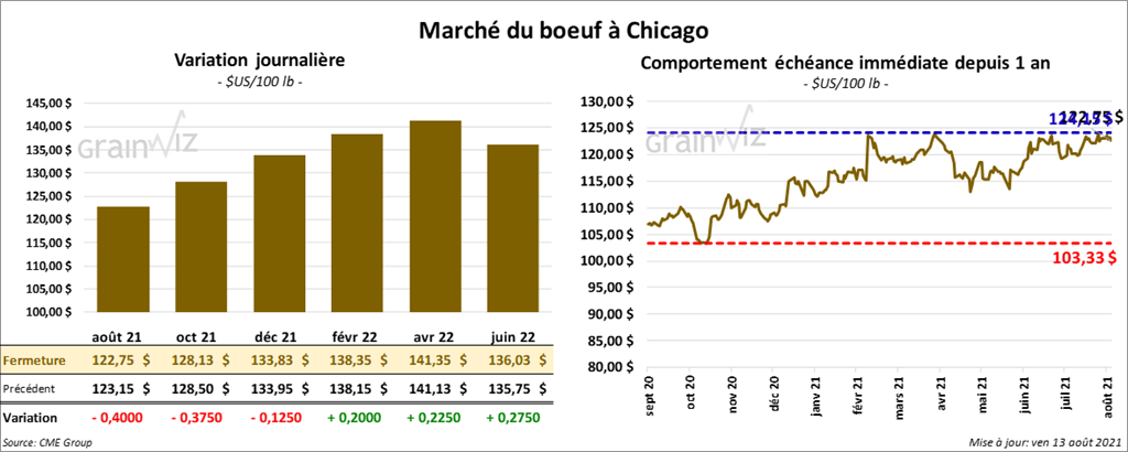 - Le 11 août dernier, le CME Feeder Cattle Index était en hausse de 6 cents à 156,25 $.