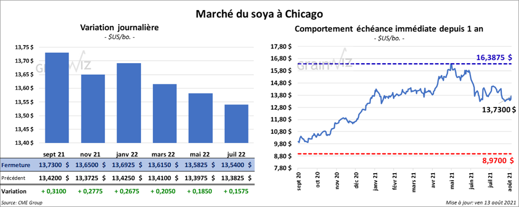 Les contrats de soya US aux échéances les plus rapprochées ont fermé en hausse entre 20 ½ et 31 cents. Ceux de soya US aux échéances les plus rapprochées ont fini la journée en progression entre 1,90 et 2,40 $/tonne. Les contrats d’huile de soya US aux échéances les plus rapprochées ont également terminé avec des gains entre 147 et 164 points.