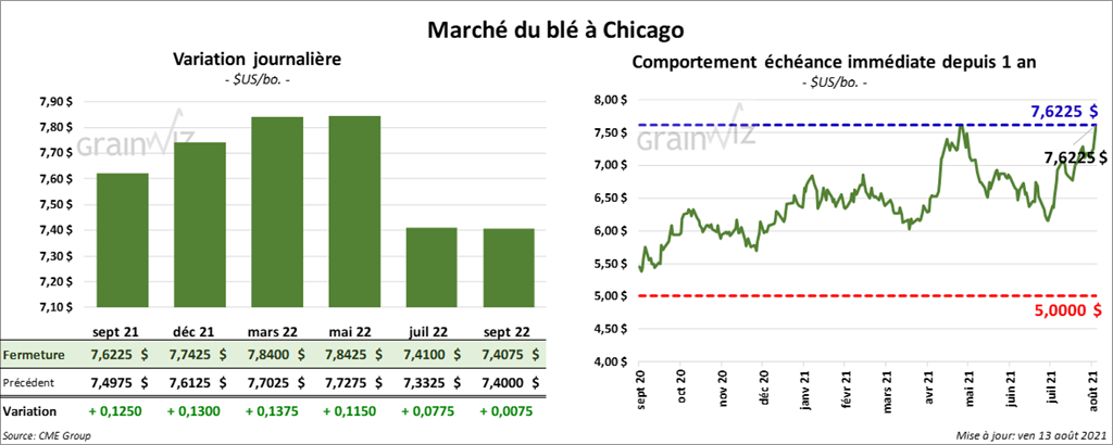 À Chicago, les contrats de blé aux échéances les plus rapprochées ont clôturé en progression entre 12 ½ et 13 ¾ cents. À Kansas, les contrats de blé dur rouge aux échéances les plus rapprochées ont également fermé en hausse entre 2 et 4 ¼ cents. À Minneapolis, ceux de blé de printemps aux échéances les plus rapprochées ont terminé avec des gains entre 8 ½ et 11 ½ cents.