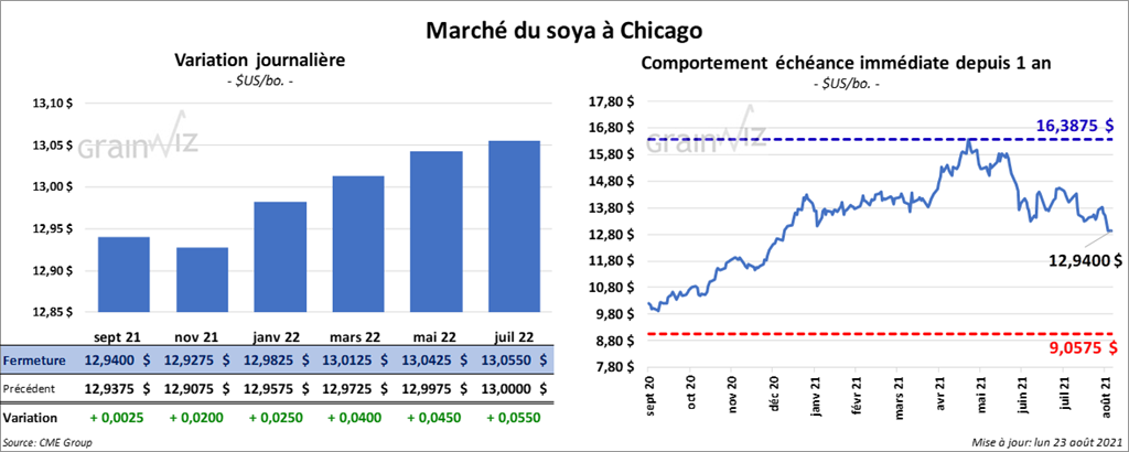 Les contrats de soya US aux échéances les plus rapprochées ont fini la journée en hausse entre ¼ et 2 ½ cents. Ceux de tourteau de soya US aux échéances les plus rapprochées ont fait l’inverse en terminant en baisse entre 6,40 et 7,20 $/tonne. Les contrats d’huile de soya US aux échéances les plus rapprochées ont clôturé avec des gains entre 176 et 191 points.