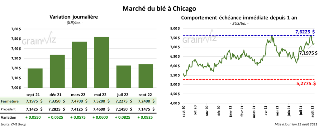 À Chicago, les contrats de blé aux échéances les plus rapprochées ont terminé la session en hausse entre 5 ¼ et 5 ¾ cents. À Kansas, les contrats de blé dur rouge aux échéances les plus rapprochées ont clôturé avec des gains entre 1 ¾ et 2 ¼ cents. À Minneapolis, ceux de blé de printemps ont fermé en hausse entre 1 et 6 ¼ cents.