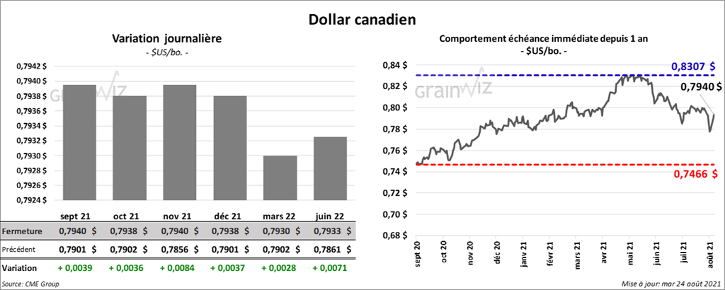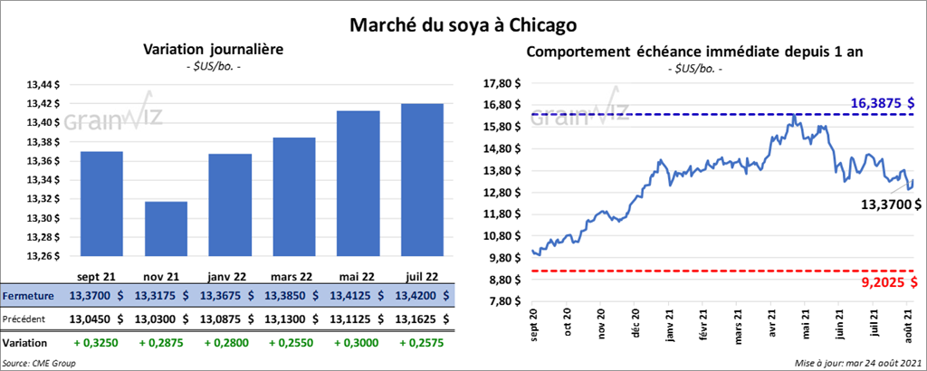 Les contrats de soya US aux échéances les plus rapprochées ont clôturé en hausse entre 25 ½ et 32 ½ cents. Ceux de tourteau de soya US aux échéances les plus rapprochées ont également fermé dans le vert entre 7,40 et 8,30 $/tonne. Les contrats d’huile de soya US aux échéances les plus rapprochées ont terminé la journée en progression entre 184 et 195 points.