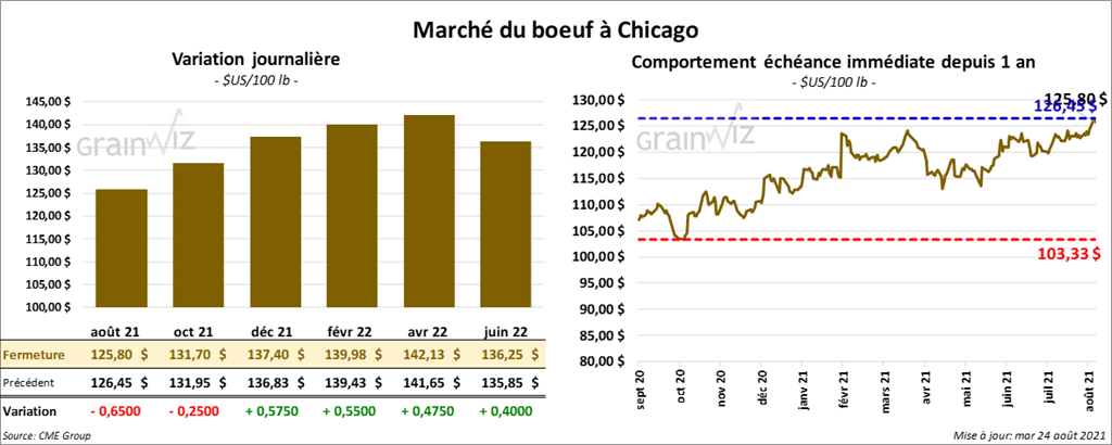 Les contrats de bœuf US aux échéances les plus rapprochées ont terminé la session quelque part entre une baisse de 65 cents et une augmentation de 57 cents. Ceux de veau US aux échéances les plus rapprochées ont fini en recul entre 45 cents et 1,52 $. Celui août 21 a fait exception en clôturant en hausse de 37 cents.