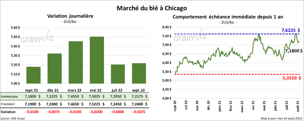 À Chicago, les contrats de blé ont fini la journée en baisse entre ¾ et 1 cent. À Kansas, les contrats de blé dur rouge aux échéances les plus rapprochées ont clôturé quelque part entre un recul de 2 cents et une hausse de 1 ¼ cent. À Minneapolis, ceux de blé de printemps aux échéances les plus rapprochées ont terminé la session en hausse entre 4 et 6 cents.
