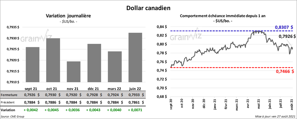 Les contrats de soya US aux échéances les plus rapprochées ont clôturé en hausse entre 1 ¼ et 3 ½ cents. Le contrat septembre 21 a fait exception en terminant la session en baisse de 3 cents. Les contrats de tourteau de soya US aux échéances les plus rapprochées ont fermé dans le rouge entre 2,30 et 3,50 $/tonne. Ceux d’huile de soya US aux échéances les plus rapprochées ont fait l’inverse en finissant en hausse entre 29 et 31 points. Par contre, celui septembre 21 a fait exception en clôturant en baisse de 3 points.