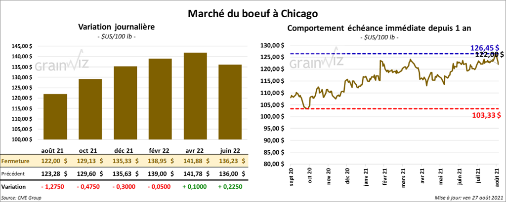 Les contrats de bœuf US aux échéances les plus rapprochées ont clôturé en baisse entre 5 cents et 1,27 $. Ceux de veau US aux échéances les plus rapprochées ont terminé en hausse entre 15 et 42 cents.