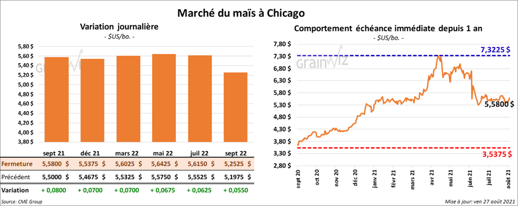 - CFTC : Le 24 août dernier, les spéculateurs avaient réduit leurs positions dans le maïs US de 2,8 % à 270,994 contrats. Le minimum des 52 dernières semaines était de 18,659 contrats et le maximum de 401,993 contrats.