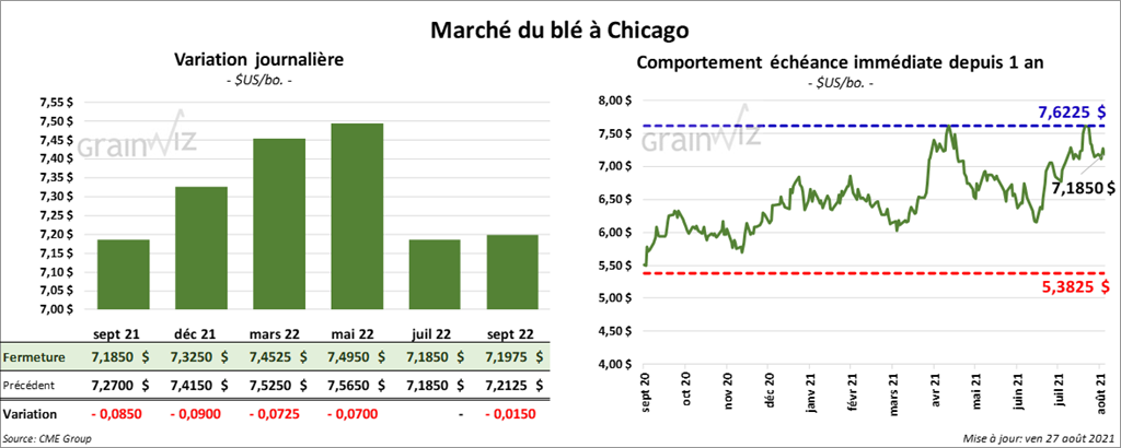 À Chicago, les contrats de blé US aux échéances les plus rapprochées ont terminé la session en baisse entre 7 ¼ et 9 cents. À Kansas, ceux de blé dur rouge aux échéances les plus rapprochées ont clôturé en recul entre 3 ¼ et 4 ¼ cents. À Minneapolis, les contrats de blé de printemps aux échéances les plus rapprochées ont fini en hausse entre 2 et 7 ¾ cents.
