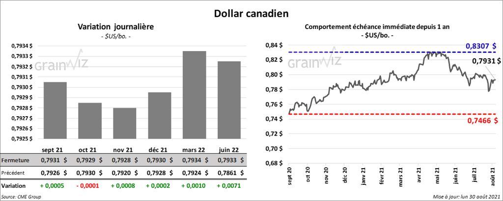 - Selon Statistique Canada, les imageries satellites ont indiqué que comparativement à l’an passé, la production de blé canadien devrait baisser de 34,8 % pour s’établir à 22,9 millions de tonnes. Les anticipations des analystes étaient de 22,6 millions de tonnes. Statistique Canada explique que les rendements sont plus faibles que prévu à 37,2 bo/acre et que les superficies récoltées devraient être en baisse de 8,5 % à 22,7 millions d’acres. Cette réduction des superficies récoltées est attribuable à la baisse des superficies ensemencées en blé de printemps et à la sécheresse qui a touché l’Ouest canadien.