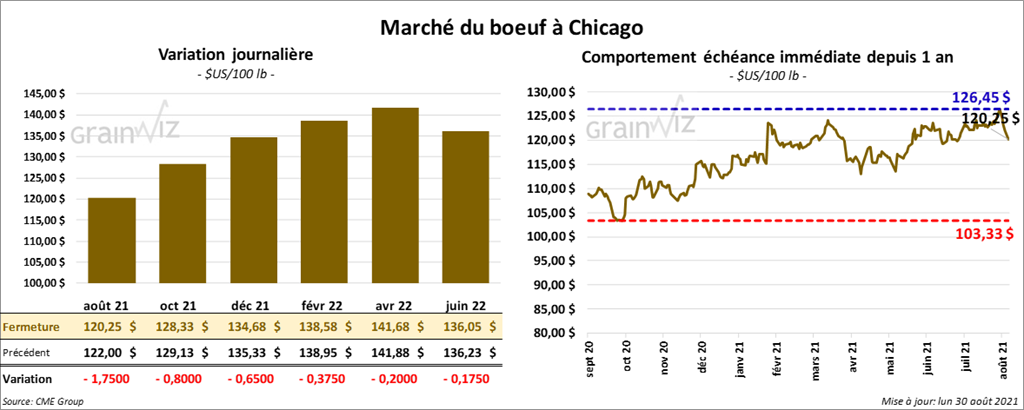 Les contrats de bœuf US aux échéances les plus rapprochées ont terminé la séance en baisse entre 37 cents et 1,75 $. Ceux de veau US aux échéances les plus rapprochées ont fait l’inverse en clôturant en hausse entre 45 et 57 cents. Celui septembre 21 a fait exception en fermant dans le rouge par 60 cents.
