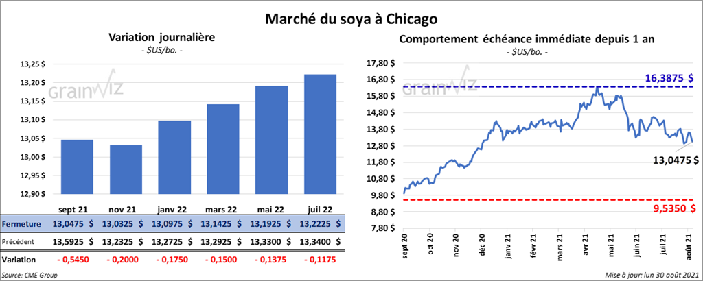 Les contrats de soya US aux échéances les plus rapprochées ont clôturé avec des pertes entre 15 et 54 ½ cents. Ceux de tourteau de soya US aux échéances les plus rapprochées ont terminé la séance en baisse entre 4,70 et 6,60 $. Les contrats d’huile de soya US aux échéances les plus rapprochées ont fermé en recul entre 82 et 112 points.