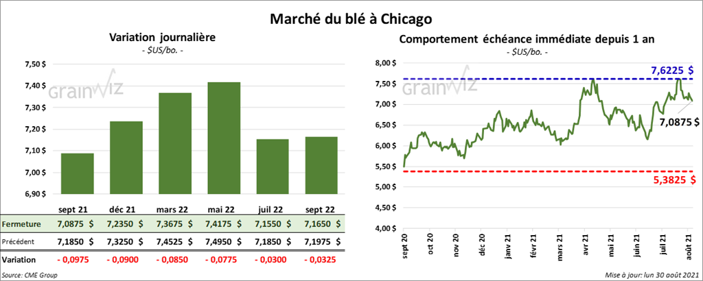 À Chicago, les contrats de blé aux échéances les plus rapprochées ont terminé la journée en baisse entre 7 ¾ et 9 ¾ cents. À Kansas, ceux de blé dur rouge ont également fini en recul entre 8 et 11 ½ cents. À Minneapolis, les contrats de blé de printemps ont clôturé dans le rouge entre 5 ½ et 16 ¼ cents.