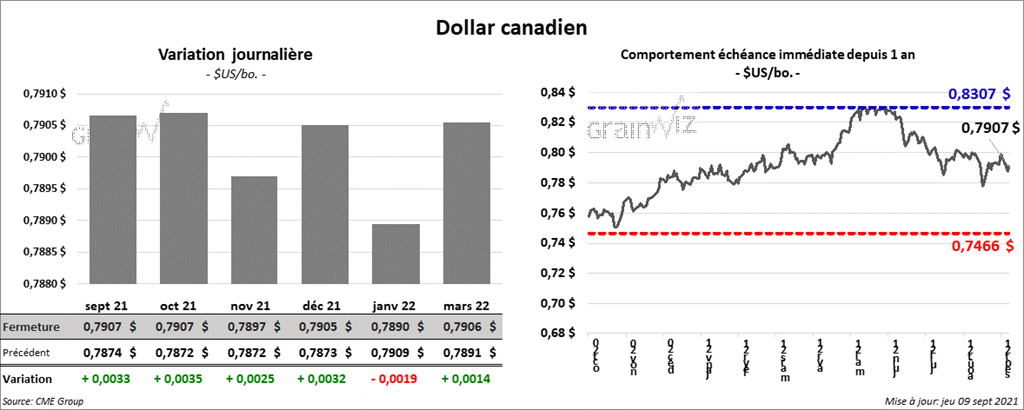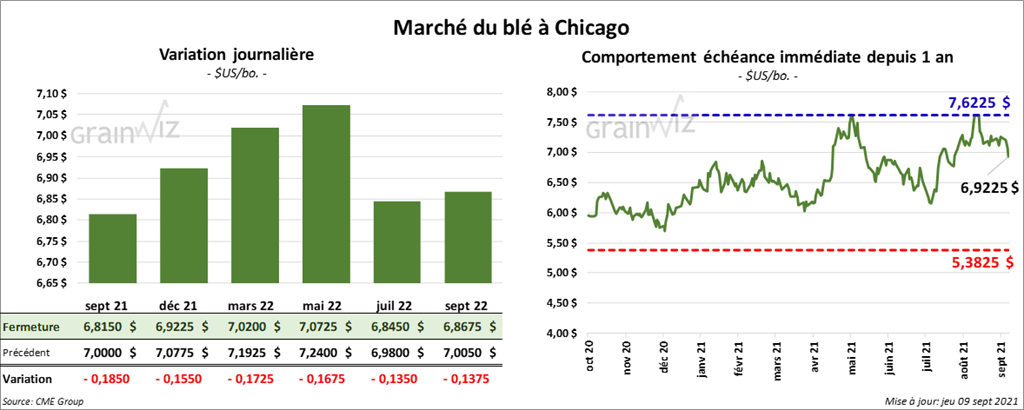 - Pour le rapport d’offre et de demande, les analystes prévoient des stocks de blé US 2021/22 à la baisse comparativement à août dernier à 616 millions de boisseaux.