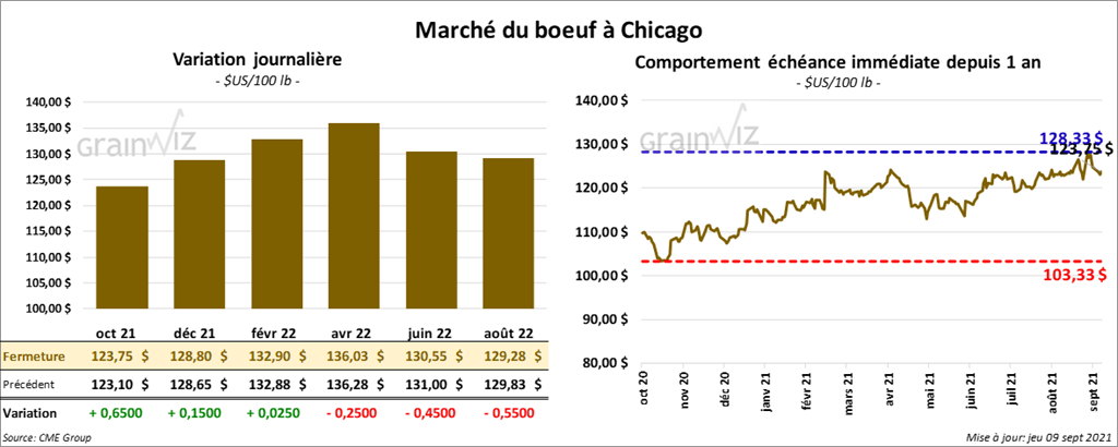 - Le 8 septembre dernier, le CME Feeder Cattle Index était en baisse de 64 cents 156,83 $.