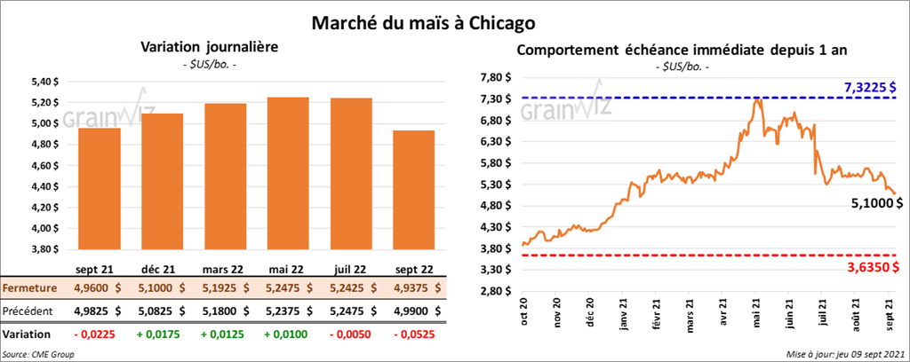 - Demain, l’USDA va publier son rapport d’offre et demande pour le mois de septembre. Un sondage montre que les analystes s’attendent à une augmentation de la production de maïs US de 1,3 % par rapport à août dernier à 14,942 milliards de boisseaux pour une superficie récoltée de 85,1 bo/acre. En août dernier, c’était 84,5 bo/acre. Les rendements sont également prévus à la hausse par rapport à août dernier à 175,8 bpa. De plus, les stocks de fin d’année de maïs US 2021/22 sont anticipés à la baisse de 1,382 milliard de boisseaux en août dernier à 1,242 milliard de boisseaux ce mois-ci.