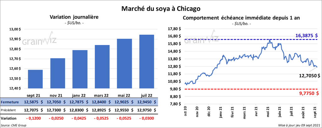 - L’USDA a annoncé dans le courant de la journée des ventes privées à l’exportation de 132,000 tonnes de soya US. Les livraisons sont prévues en 2021/22 et la Chine en est la destination.