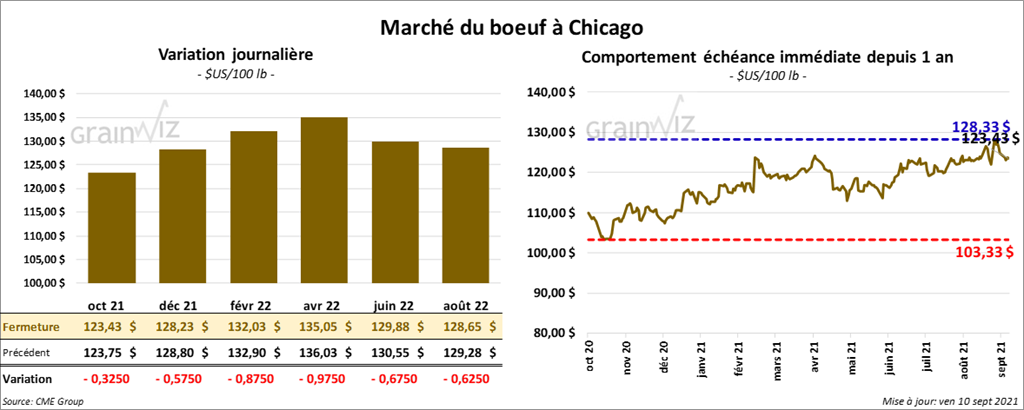 - Le 9 septembre dernier, le CME Feeder Cattle Index était en baisse de 1,83 $ à 155,00 $.