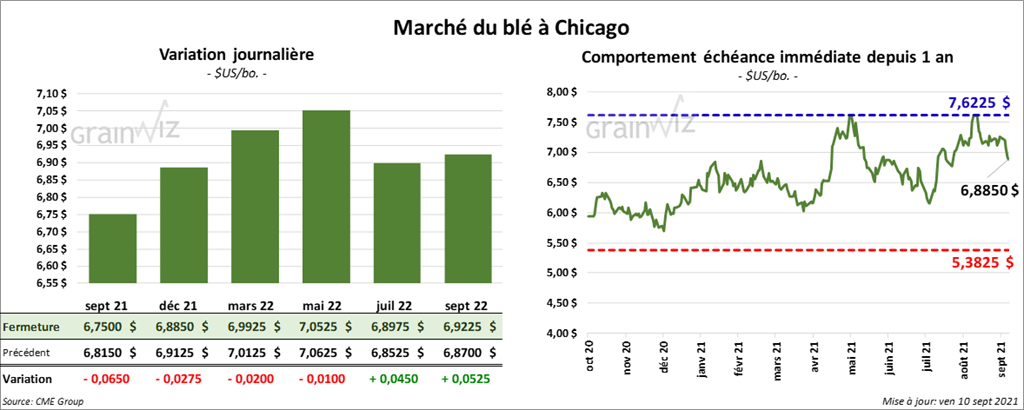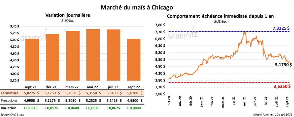 - Le rapport d’offre et de demande de septembre a été présenté ce midi. Dans le cas du maïs US 2021/22, l’USDA estime la production à la hausse de 14,750 milliards de boisseaux en août dernier à 14,996 milliards de boisseaux ce mois-ci. Par ailleurs, il a noté les superficies récoltées à la hausse de 84,5 millions d’acres en août à 85,1 millions d’acres ce mois-ci. L’USDA voit les rendements en progression par rapport à août dernier à 176,3 bpa ce mois-ci. En ce qui concerne les inventaires de fin d’année de maïs US 2021/22, l’USDA les estime à la hausse de 1,242 milliard de boisseaux comparativement août dernier à 1,408 milliard de boisseaux.