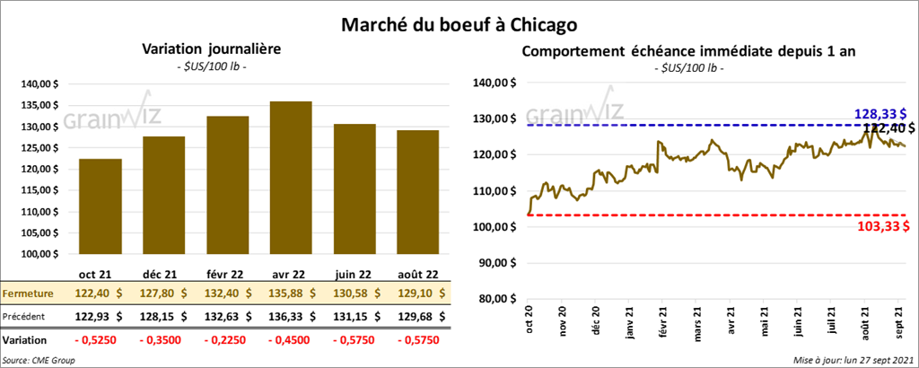 - Le 24 septembre dernier, le CME Feeder Cattle Index était en hausse de 89 cents à 154,87 $.