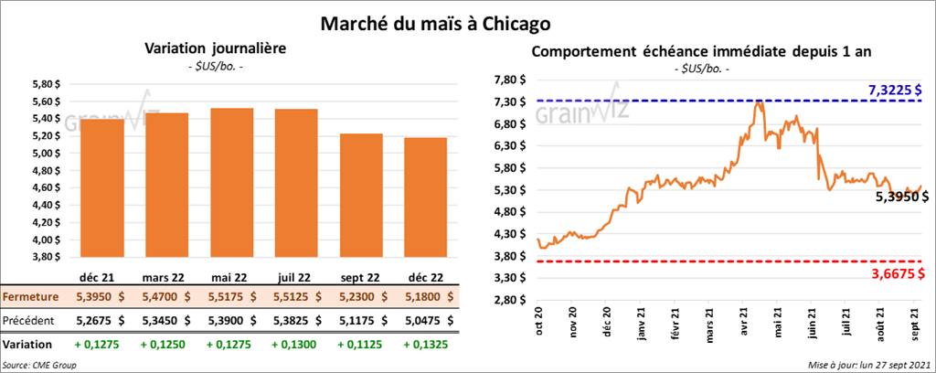 Les contrats de maïs US aux échéances les plus rapprochées ont terminé la journée en hausse entre 12 ½ et 12 ¾ cents.
