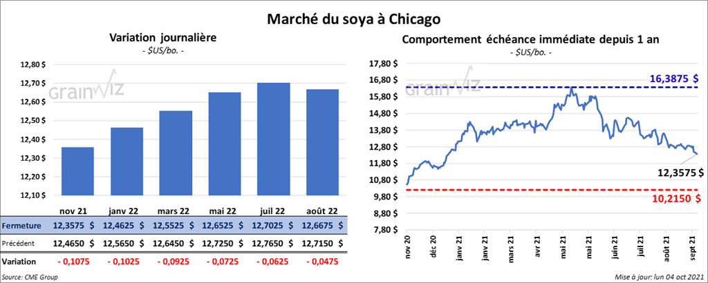 Les contrats de soya US aux échéances les plus rapprochées ont clôturé en baisse entre 7 ¼ et 10 ¾ cents. Ceux de tourteau de soya US aux échéances les plus rapprochées ont également terminé dans le rouge entre 3,30 et 3,40 $/tonne. Les contrats d’huile de soya US aux échéances les plus rapprochées ont fini en hausse entre 1 et 2 points.