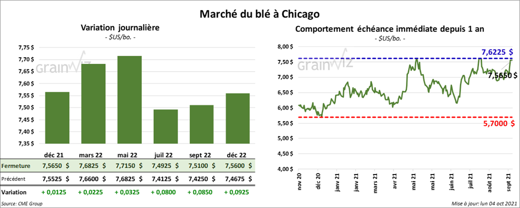 À Chicago, les contrats de blé aux échéances les plus rapprochées ont fermé en hausse entre 1 ¼ et 3 ¼ cents. À Kansas, les contrats de blé dur rouge aux échéances les plus rapprochées ont clôturé entre une baisse de 5 ¼ cents et une hausse de 1 ¾ cent. À Minneapolis, les contrats de blé de printemps aux échéances les plus rapprochées ont terminé la séance en progression entre 1 ¼ et 6 ½ cents.