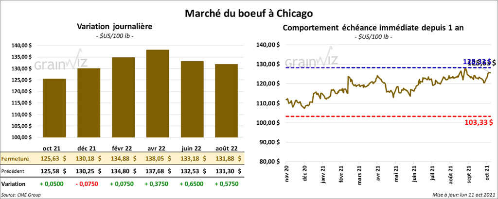 Les contrats de bœuf US aux échéances les plus rapprochées ont fini la journée en hausse entre 5 et 37 cents. Celui décembre 21 a fait l’inverse en clôturant en baisse de 7 cents. Ceux de veau US aux échéances les plus rapprochées ont terminé la séance en hausse entre 57 et 97 cents. Celui octobre 21 a fait exception en fermant en recul de 15 cents.