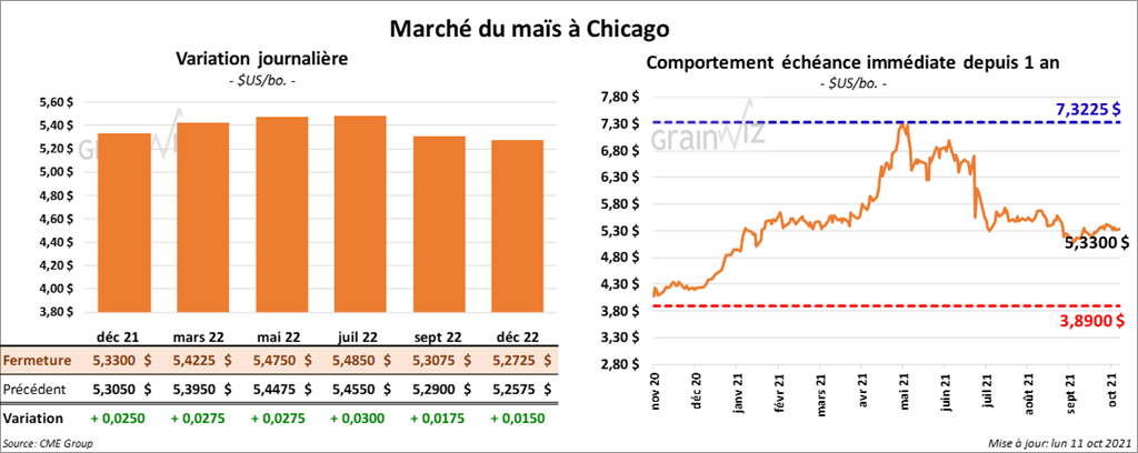- Le rapport mensuel d’offre et de demande d’octobre sera présenté demain. Un sondage de Reuters indique que les analystes prévoient une production de maïs US à 14,973 milliards de boisseaux comparativement à 14,996 milliards de boisseaux en septembre dernier. Quant aux rendements, les analystes les projettent à 176,0 bpa contre 176,3 bpa en septembre. Du côté des superficies récoltées, ils les anticipent à 85,095 millions d’acres comparativement à 95,085 millions d’acres en septembre dernier. Enfin, les inventaires de fin d’année sont prévus à 1,432 milliard de boisseaux contre 1,408 milliard de boisseaux en septembre.