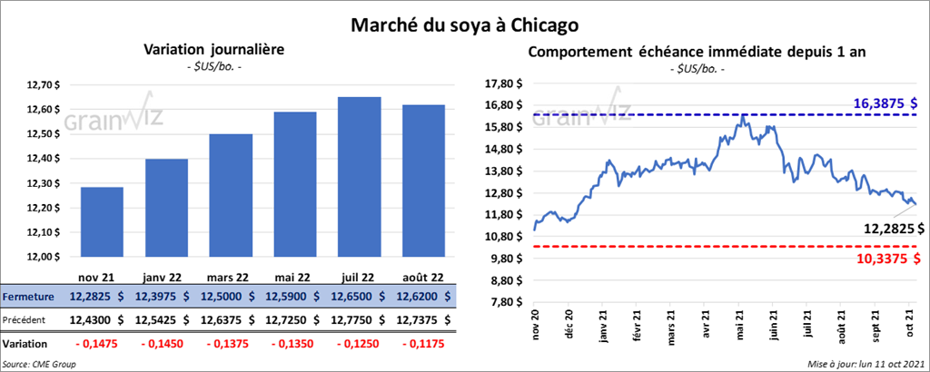 Les contrats de soya US aux échéances les plus rapprochées ont clôturé la journée en baisse entre 13 ½ et 14 ¾ cents. Les contrats de tourteau de soya US aux échéances les plus rapprochées ont également terminé la séance dans le rouge entre 1,30 et 1,70 $/tonne. Ceux d’huile de soya US aux échéances les plus rapprochées ont fini avec des pertes entre 96 et 100 points.