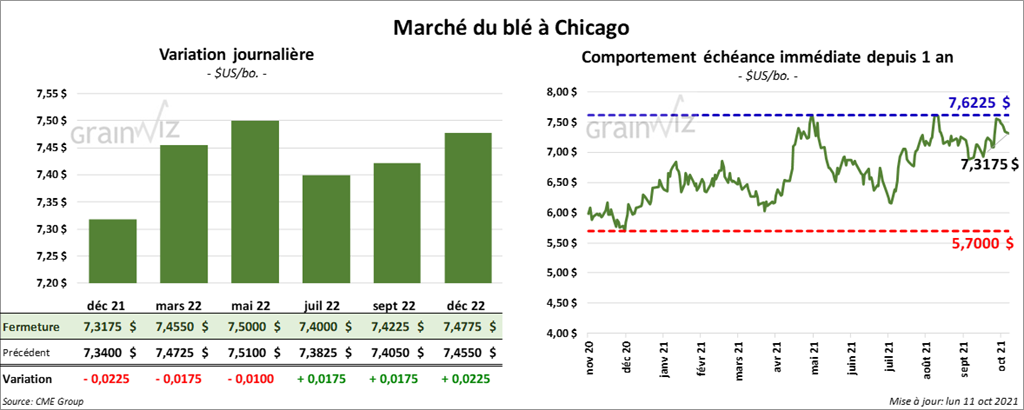 À Chicago, les contrats de blé US aux échéances les plus rapprochées ont terminé la séance à la baisse entre 1 et 2 ¼ cents. À Kansas, les contrats de blé dur rouge aux échéances les plus rapprochées ont fini en recul entre 2 et 3 cents. À Minneapolis, les contrats de blé de printemps aux échéances les plus rapprochées ont fermé avec des pertes entre ¾ et 1 cent.