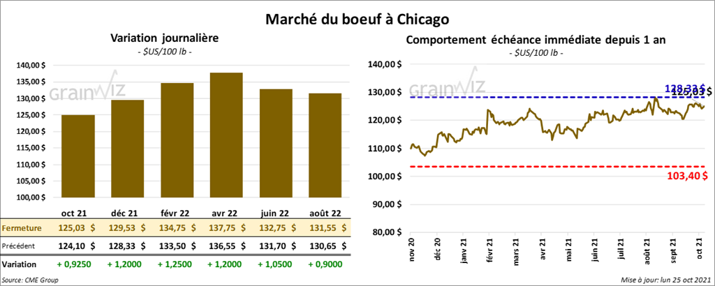 Les contrats de bœuf US aux échéances les plus rapprochées ont clôturé en progression entre 92 cents et 1,25 $. Ceux de veau US aux échéances les plus rapprochées ont aussi terminé dans le vert entre 20 cents et 1,57 $.