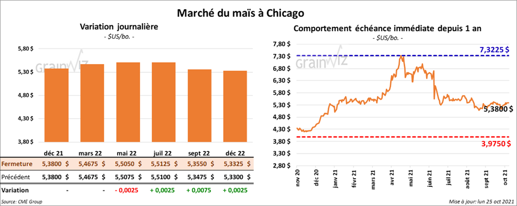 Les contrats de maïs US aux échéances les plus rapprochées ont terminé la journée entre le neutre et une baisse de ¼ cent.