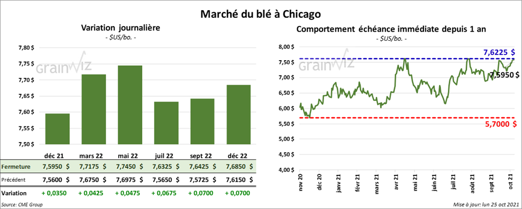 À Chicago, les contrats de blé aux échéances les plus rapprochées ont terminé la session en hausse entre 3 ½ et 4 ¾ cents. À Kansas, ceux de blé dur rouge aux échéances les plus rapprochées ont clôturé en progression entre 3 ¾ et 4 ½ cents. À Minneapolis, les contrats de blé de printemps aux échéances les plus rapprochées ont également fini la séance avec des gains entre 13 et 14 ½ cents.
