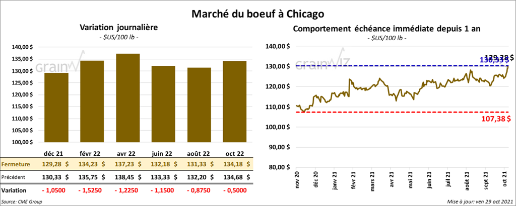 Les contrats de bœuf US aux échéances les plus rapprochées ont terminé la séance en baisse entre 1,05 et 1,52 $. Ceux de veau US aux échéances les plus rapprochées ont également fini la journée dans le rouge entre 1,07 et 1,45 $.
