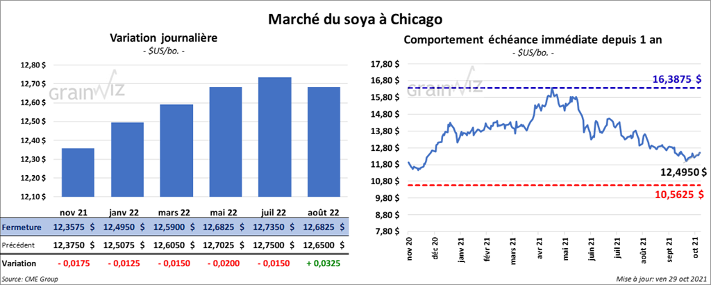 Les contrats de soya US aux échéances les plus rapprochées ont clôturé en baisse entre 1 ¼ et 1 ¾ cent. Ceux de tourteau de soya US aux échéances les plus rapprochées ont fait l’inverse en fermant en hausse entre 80 cents et 1,70 $/tonne. Les contrats d’huile de soya US aux échéances les plus rapprochées ont fait de même en finissant avec des gains entre 35 et 40 points.
