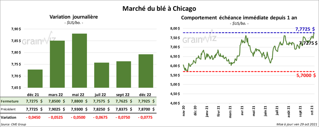 À Chicago, les contrats de blé aux échéances les plus rapprochées ont terminé la journée en baisse entre 4 ½ et 5 ¼ cents. À Kansas, ceux de blé dur rouge aux échéances les plus rapprochées ont clôturé avec des pertes entre 3 ¾ et 4 ¼ cents. À Minneapolis, les contrats de blé de printemps aux échéances les plus rapprochées ont fini la session en hausse entre 12 et 14 ¾ cents.
