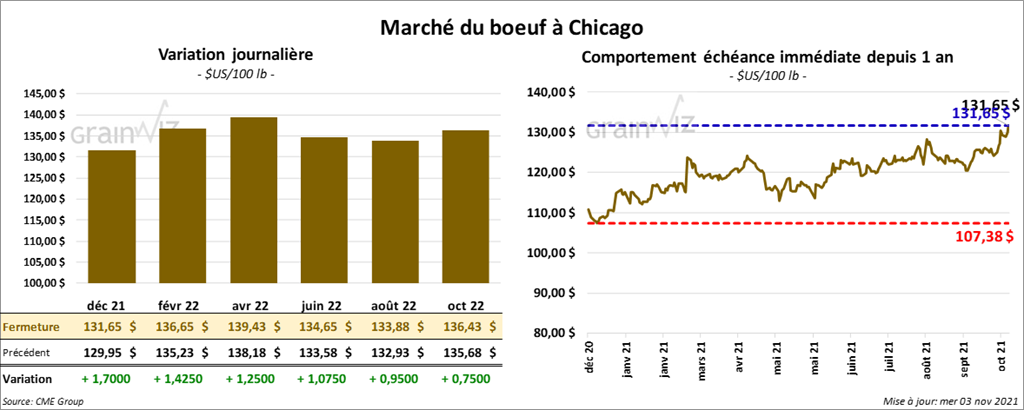 - Le 2 novembre dernier, le CME Feeder Cattle Index a été en baisse de 61 cents à 155,65 $.