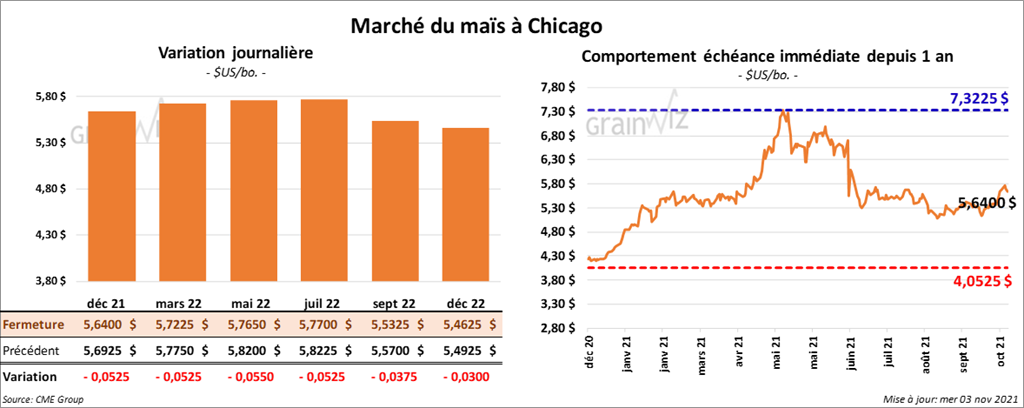 Les contrats de maïs US aux échéances les plus rapprochées ont clôturé en baisse entre 5 ¼ et 5 ½ cents.