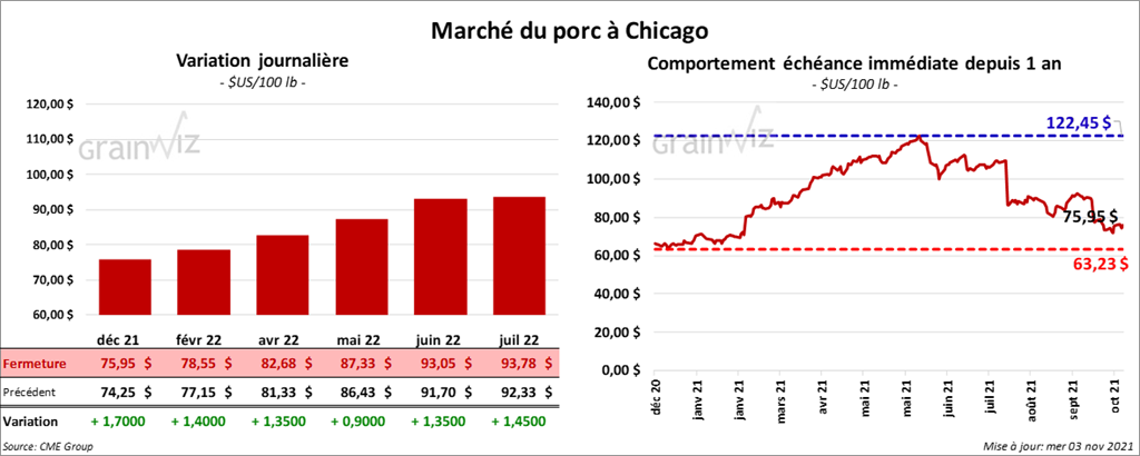 - Le 1er novembre dernier, le CME Lean Hog Index a été en baisse de 12 cents à 79,04 $.